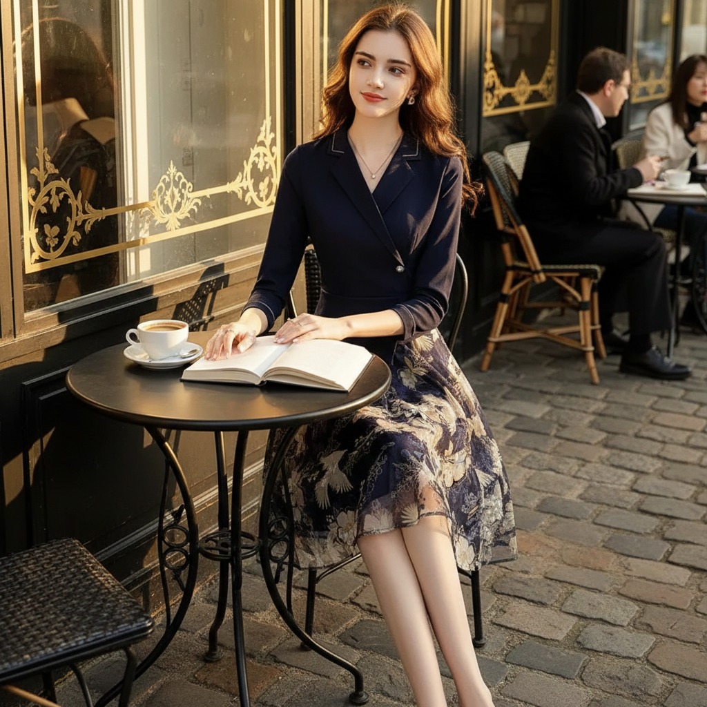 The tailored upper silhouette creates a polished and contemporary look, while the midi-length skirt features an artistic print inspired by Japanese aesthetics. Together, these elements create an elegant Japanese dress with a distinctive character.